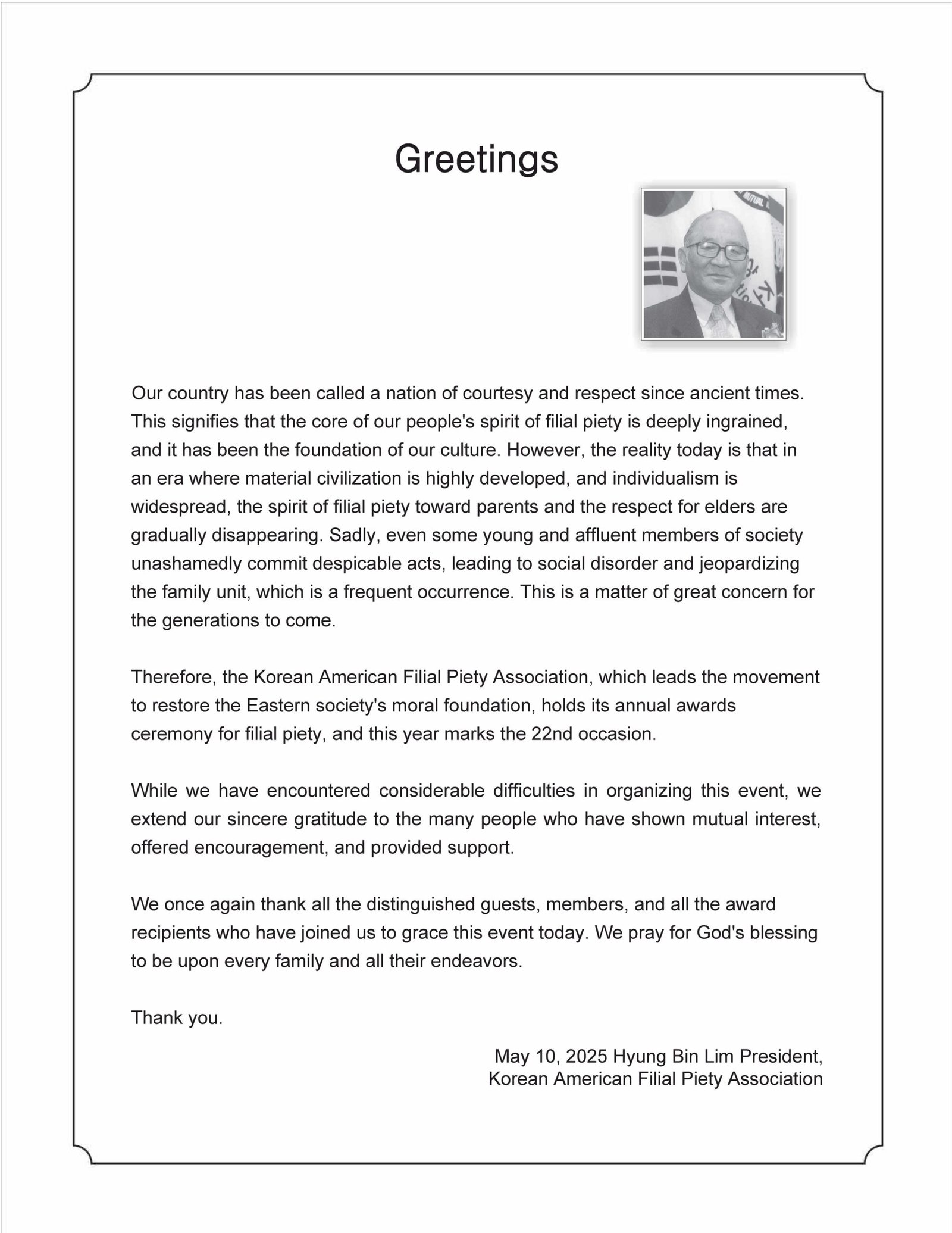 Through the practice of Chunghyo, we hope to build harmonious families and pioeer a happy futureㅊ where spiritual values and material progress coexist in perfect balance.